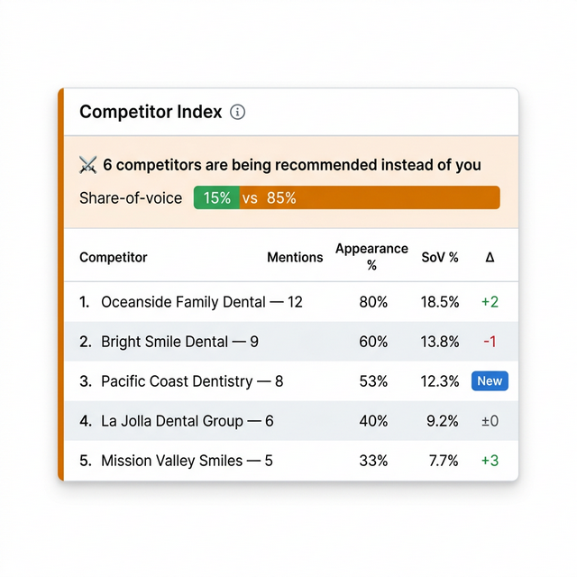 A ranked leaderboard of every business AI mentions in your market. See their scores, track their movement, and understand the competitive landscape from AI's perspective.