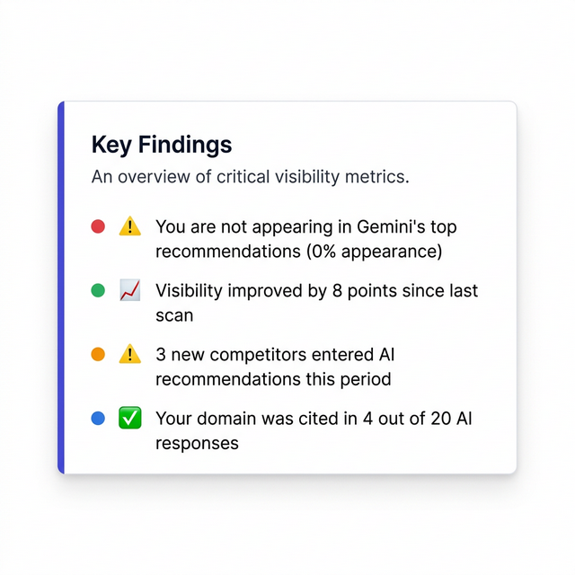 Every scan surfaces the most important insights first. Know immediately if you're missing from a major AI model, if competitors are gaining ground, or if your visibility is trending up — no digging required.