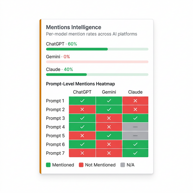 See your mention rate across each AI model with a prompt-by-prompt breakdown. Identify exactly which queries generate mentions and which models are blind to your business, so you know where to focus.