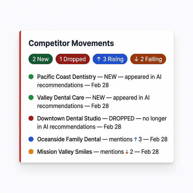 Get notified when competitors enter or leave AI recommendations, when scores shift significantly, or when new businesses appear. Never be caught off guard by changes in AI visibility.