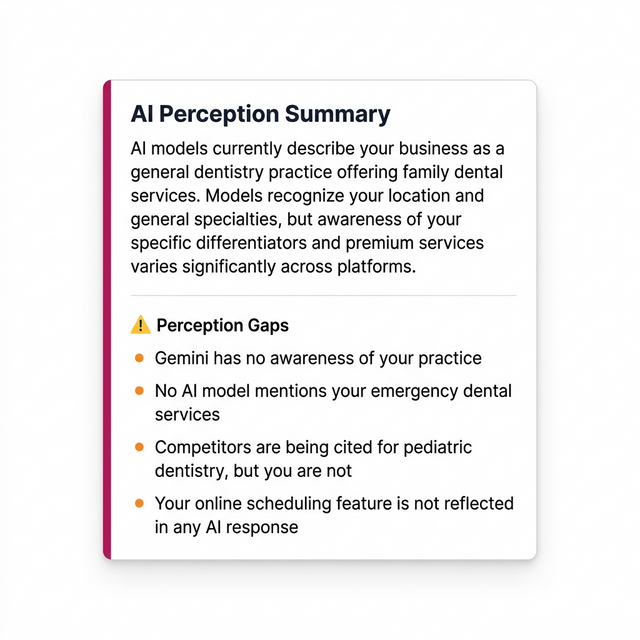 Read exactly how AI describes your business — what it gets right, what it gets wrong, and what it doesn't know. Surface perception gaps between what you offer and what AI tells potential customers.